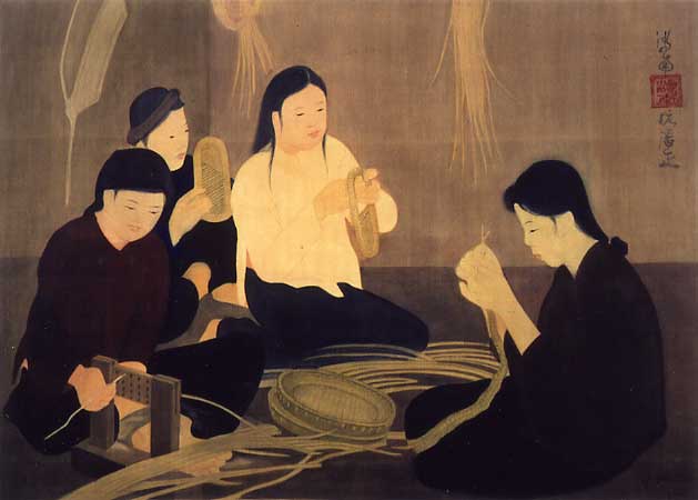 ベトナムにおいて、絹絵は20世紀はじめに生まれたジャンルで、それまでは宗教画や指導者層などの肖像画にその技法は使われていた。グエン・ファン・チャン(1892-1984)は、その絹絵の題材を“ベトナムの日常生活”にとった絹絵の分野の開拓者であり、大家として活躍した。本作品も、グエン・ファン・チャンらしい、詩情をおびた、柔らかい落ち着いた色調で、働く少女たちが描かれている。